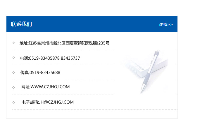 傳真:0519-83435688    郵編:213135    網(wǎng)址:WWW.czjhgj_com.jinbangty.com    電子郵箱:JH@czjhgj_com.jinbangty.com